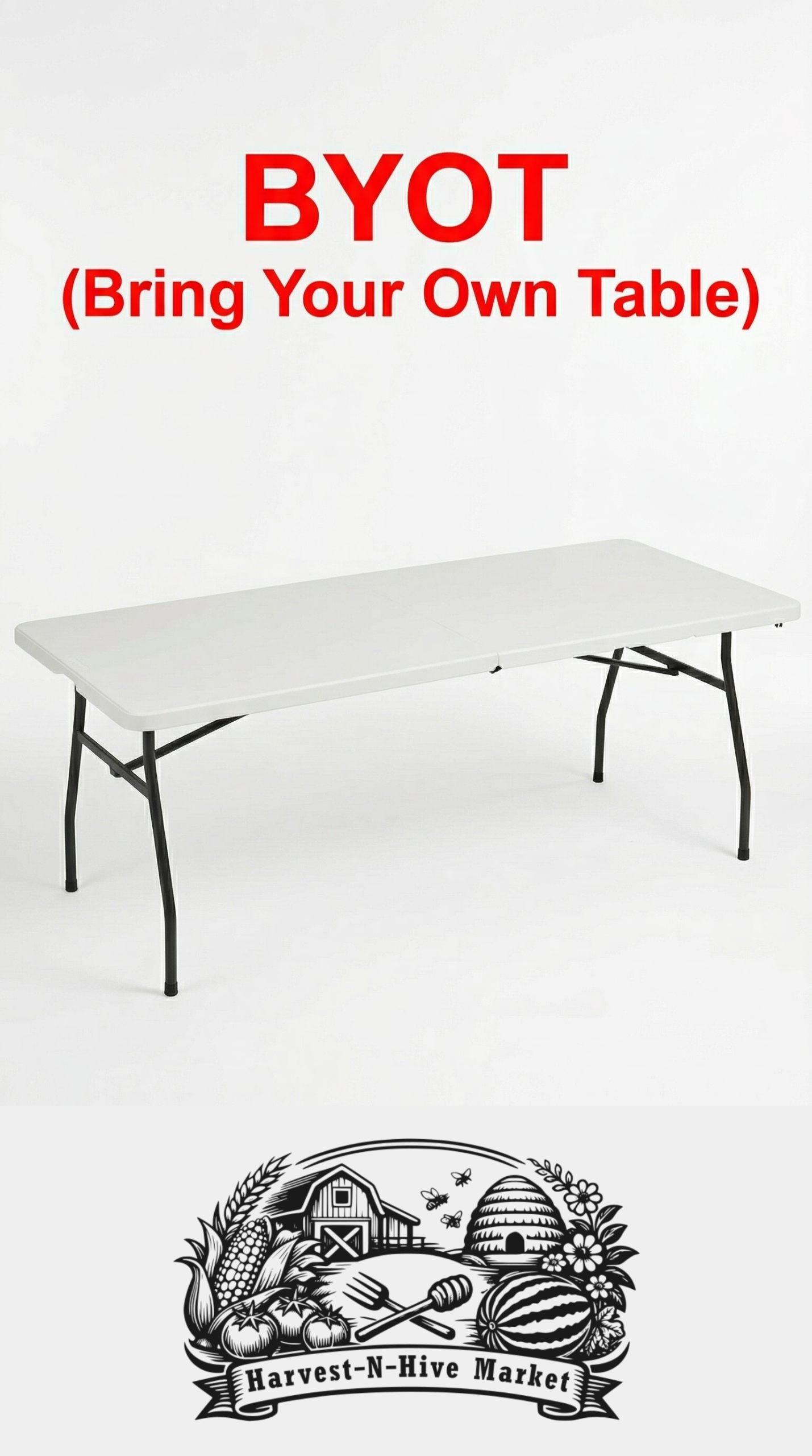 This is for a 20′ X 20′ empty ground space. Vendors are responsible for providing their own popup tent (20′ X 20′ suggested), weights, tables, and chairs. No electricity provided. No refunds for weather.